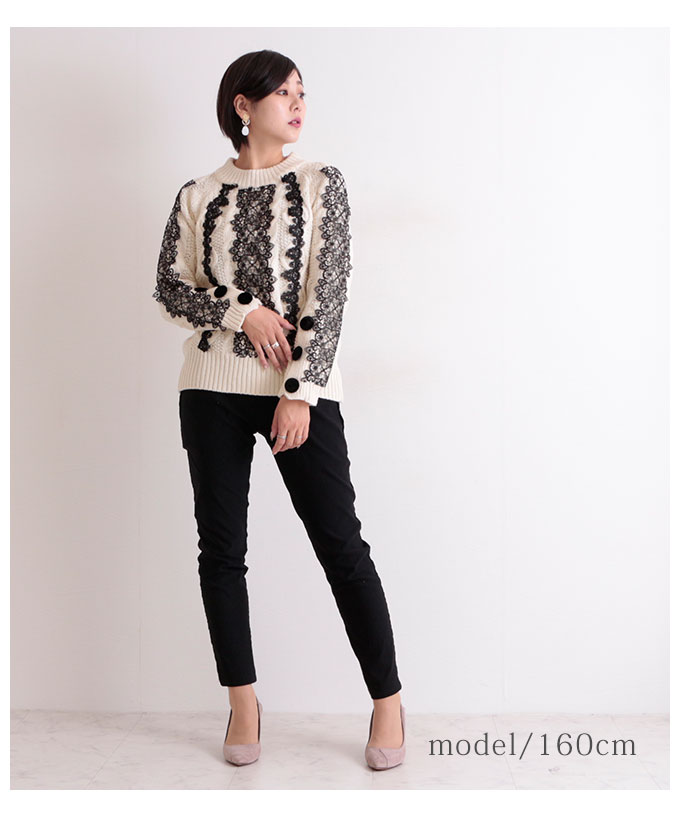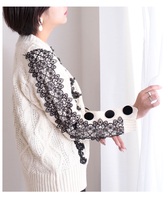 袖と前身頃にあしらわれた黒いレースが上品で大人が可愛く着こなせる1枚です。